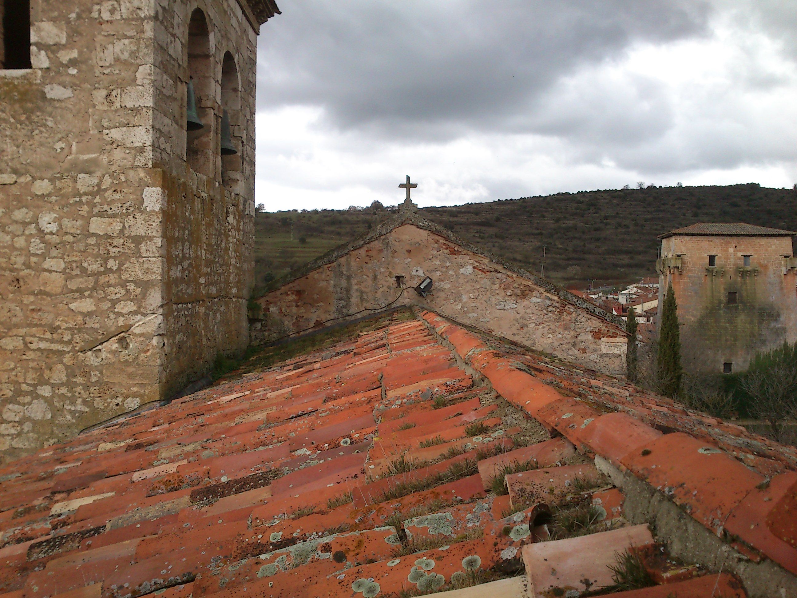 El incendio de las cubiertas de la iglesia en el año 1942 motivó la sustitución del entramado de madera original por una retícula de tabiquillos cerámicos apoyados directamente sobre las bóvedas. Esta solución resuelta con un material “incombustible”, es la responsable de los problemas de humedad que presenta la colegiata. El agua que penetra al interior del espacio de la entrecubierta no puede ser eliminada al haberse interrumpida la ventilación de esa cámara con la disposición de la retícula que soporta los faldones de la cubierta. El agua por lo tanto se mueve por gravedad hacia el espacio más caliente, el interior de la iglesia, penetrando en la piedra.